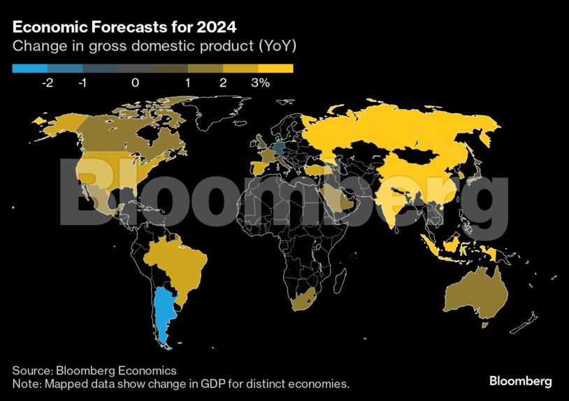 Το Bloomberg Economics προβλέπει ότι το παγκόσμιο ΑΕΠ θα αυξηθεί κατά 3% φέτος, κάτω από τον ρυθμό του 3,3% του 2023, αλλά πολύ μακριά από τις πτωτικές προβλέψεις στις αρχές του έτους.