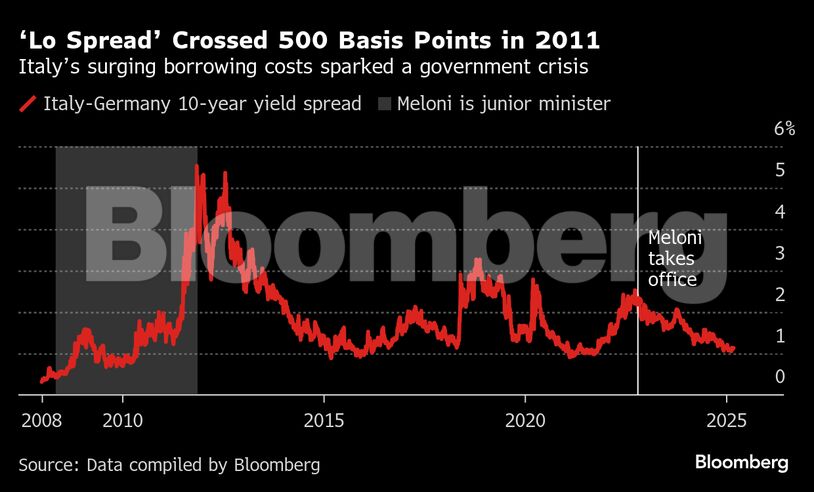 Αυτή η πρωτογενής αγωνία προέρχεται από το 2011, όταν το «lo spread», όπως είναι γνωστό σε τοπικό επίπεδο, έγινε σύνθημα στα χείλη των Ιταλών πολιτών. Ως υπουργός, η Μελόνι έγινε μάρτυρας του πολιτικού χάους καθώς η άνοδος του δείκτη στις 570 μονάδες βάσης οδήγησε στην παραίτηση του Μπερλουσκόνι από την πρωθυπουργία. Συγκριτικά, την περασμένη Δευτέρα βρισκόταν μόλις στις 113 μονάδες βάσης.