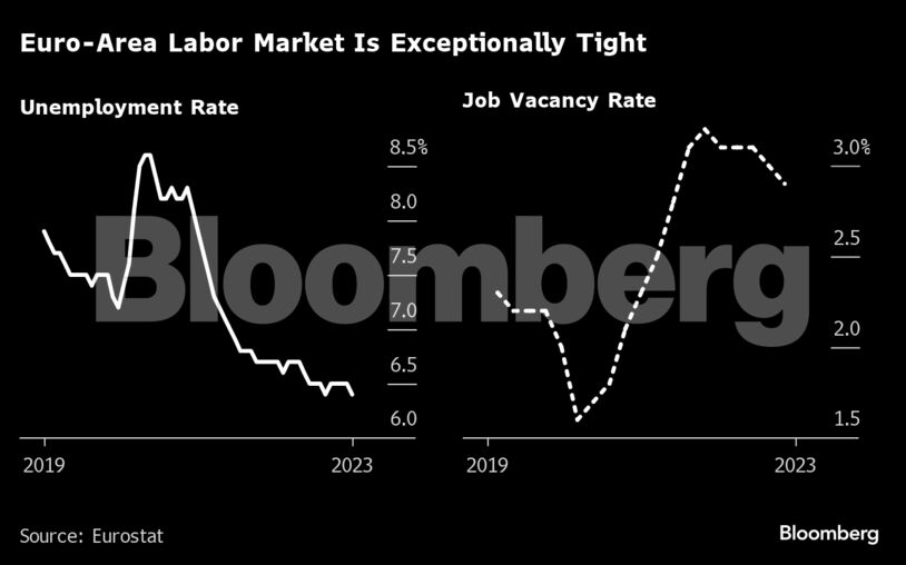H… αξιοπερίεργη ανθεκτικότητα της αγοράς εργασίας στηνΕυρωζώνη είναι αυτή, που σύμφωνα με άρθρο του Bloomberg, σπρώχνει την ΕΚΤ σε διατήρηση της πολιτικής της και και μη μεταβολή όσον αφορά τα επιτόκια.