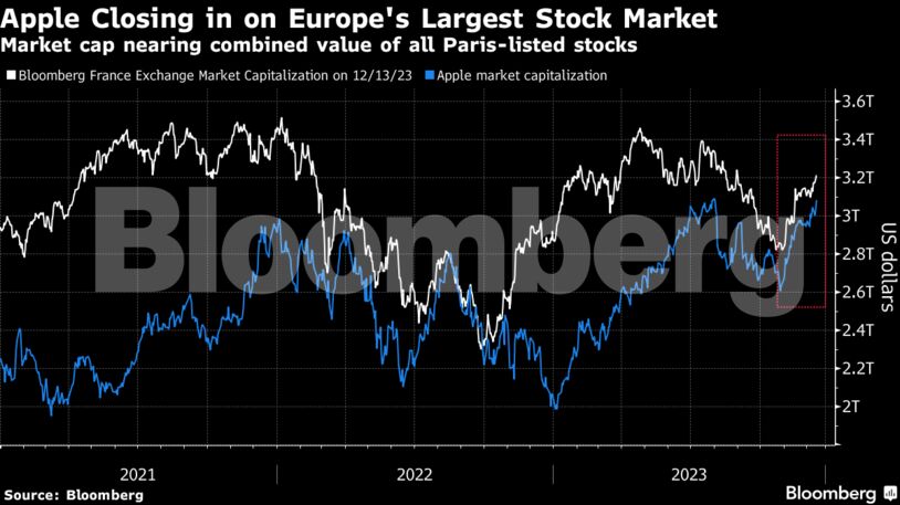 Η συνδυασμένη αξία των, εισηγμένων στην αγορά του Παρισιού, εταιρειών κυμαινόταν περίπου στα $3,25 τρισ. την Τετάρτη, έναντι των $3,1 τρισ. του τεχνολογικού κολοσσού, σύμφωνα με μελέτη του Bloomberg. Εάν ήταν αγορά, η Apple θα βρισκόταν στην 7η θέση της παγκόσμιας κατάταξης.
