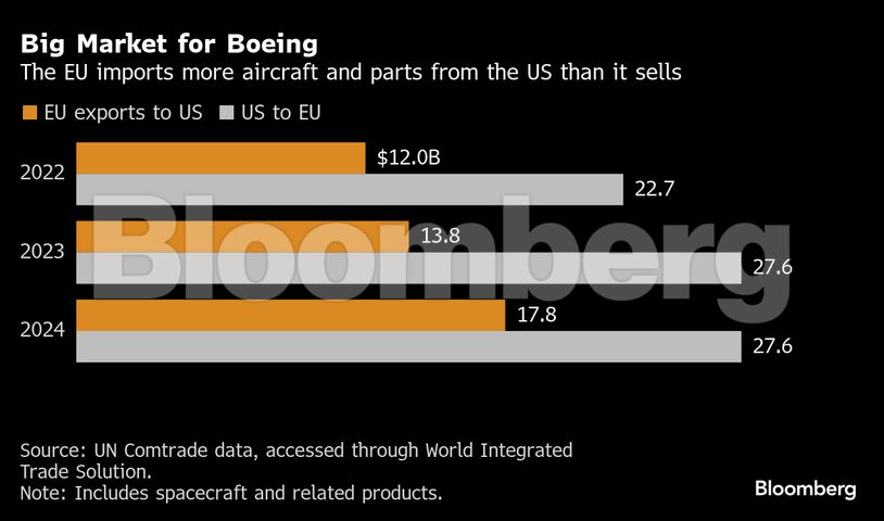Η Ευρωπαϊκή Επιτροπή, η οποία χειρίζεται τα εμπορικά θέματα της ΕΕ, πλησιάζει σε μια προκαταρκτική συμφωνία που θα εξαιρεί τα εμπορικά αεροσκάφη από ορισμένους δασμούς, κάτι το οποίο θα αποτελούσε εξαιρετικά νέα για την Airbus SE. Θα δημιουργήσει επίσης εξαιρέσεις για ορισμένους — κυρίως γερμανικούς — κατασκευαστές αυτοκινήτων, ανακουφίζοντας εταιρείες όπως η BMW AG και η Mercedes-Benz Group AG.