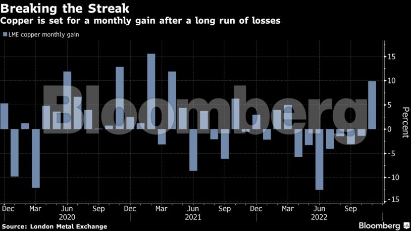 H τιμή του χαλκού ενδέχεται να καταγράψει τη μεγαλύτερη μηνιαία αύξησή της από τον Απρίλιο του 2021, αφού οι επενδυτές πια ποντάρουν πως η άρση της στρατηγικής «zero Covid» της Κίνας θα αυξήσει τη ζήτηση στη δεύτερη μεγαλύτερη οικονομία του πλανήτη.