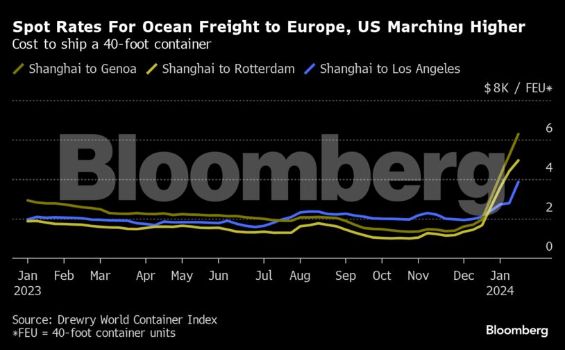 Όπως υπογραμμίζει το Bloomberg Economics τα προβλήματα τα οποία δημιουργούνται στον χώρο της ναυτιλίας θα μπορούσαν να προσφέρουν στις κεντρικές τράπεζες έναν ακόμη λόγο για καθυστέρηση της μείωσης των επιτοκίων. Οι οικονομολόγοι της JPMorgan Chase & Co προβλέπουν αύξηση του παγκόσμιου πληθωρισμού κατά 0,7% το α’ εξάμηνο του 2024 εάν η ναυτιλιακή κρίση συνεχιστεί.