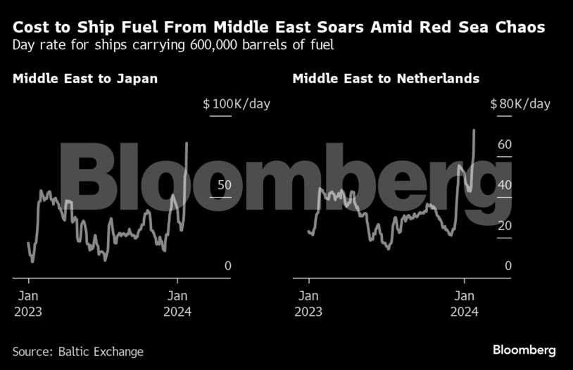 Το Bloomberg Intelligence εκτιμά ότι η αλλαγή δρομολόγησης προσθέτει περίπου 40% στην απόσταση του ταξιδιού. Αυτό, με τη σειρά του, σημαίνει καθυστερήσεις και υψηλότερο κόστος για τους μεταφορείς, με μοναδική εναλλακτική την πανάκριβη επιλογή των αερομεταφορών.