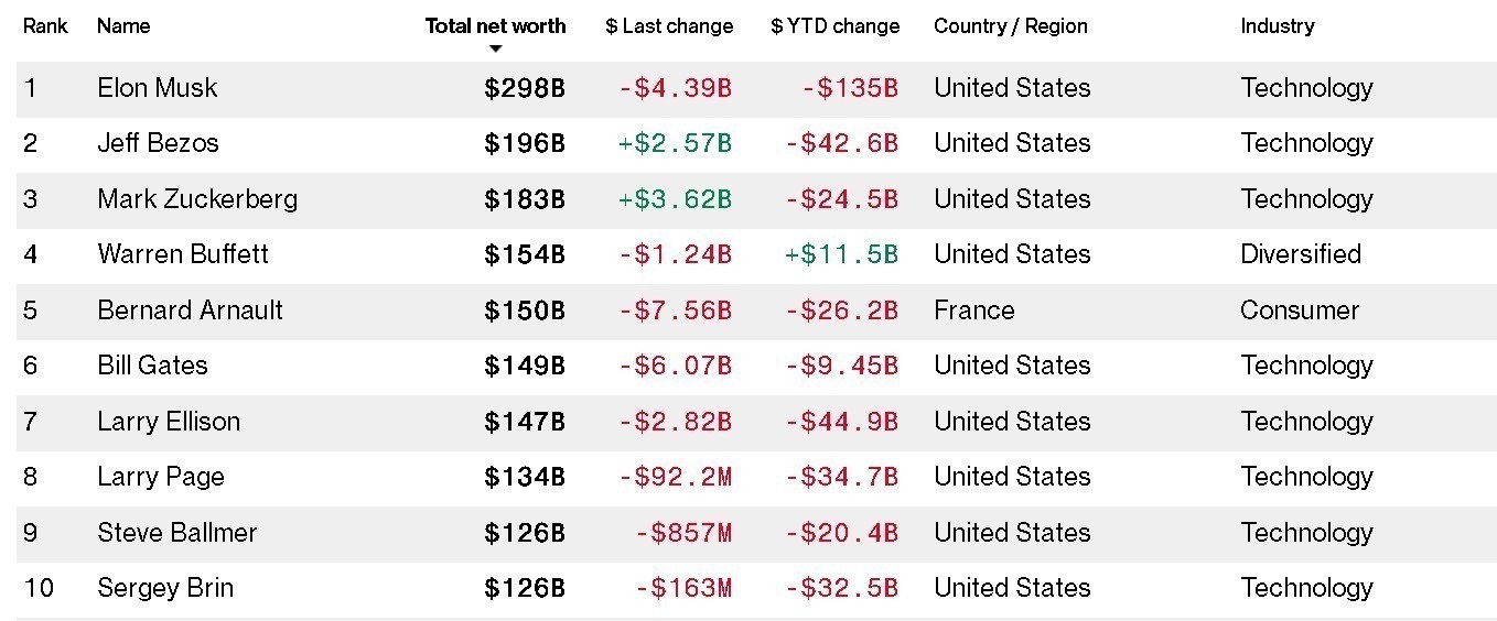 Ειδικά, ο Έλον Μασκ παρέμεινε μεν στην κορυφή της λίστας, όμως βλέποντας την προσωπική του περιουσία να έχει συρρικνωθεί κατά 135 δισ. δολάρια από την αρχή του έτους. Μάλιστα, ειδικά τη Δευτέρα η περιουσία του υποχώρησε στα 297,8 δισ. δολάρια, πέφτοντας κάτω από το όριο των 300 δισεκατομμυρίων για πρώτη φορά από τον Νοέμβριο.