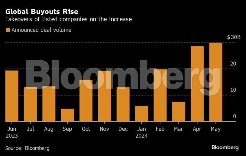 Οι εταιρείες έχουν ανακοινώσει 91 δισεκατομμύρια δολάρια για εξαγορές εισηγμένων επιχειρήσεων φέτος μέχρι τον Μάιο, ποσοστό αυξημένο κατά 16% σε σχέση με την ίδια περίοδο το 2023, σύμφωνα με στοιχεία που συγκέντρωσε το Bloomberg.