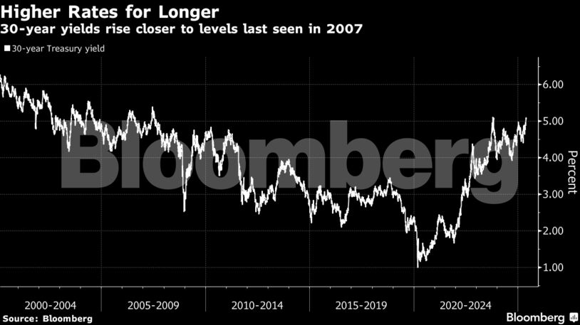Ωστόσο, πρόσφατα προέκυψε μια σημαντική εξέλιξη που απειλεί αυτή την ισορροπία. Τα 30ετή ομόλογα αναφοράς του Δημοσίου των ΗΠΑ σημείωσαν πτώση αυτό το μήνα, με τις αποδόσεις να ξεπερνούν το 5% και να φτάνουν στα υψηλότερα επίπεδα των τελευταίων δύο δεκαετιών, καθώς οι επενδυτές έγιναν όλο και πιο επιφυλακτικοί όσον αφορά τη διατήρηση μακροπρόθεσμων κρατικών τίτλων των ΗΠΑ εν μέσω της αύξησης του χρέους και των ελλειμμάτων.