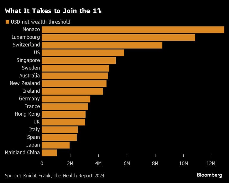 Το Μονακό διατηρεί την πρώτη θέση για το υψηλότερο όριο παγκοσμίως στα 12,8 εκατ. δολάρια, σημειώνοντας αύξηση 3,2% σε σχέση με ένα χρόνο νωρίτερα, ενώ στο Λουξεμβούργο και την Ελβετία χρειάζεται κανείς περισσότερα από 8 εκατ. δολάρια για να μπει στην κατηγορία, σύμφωνα με την έκθεση 2024 Wealth Report του μεσίτη ακινήτων.