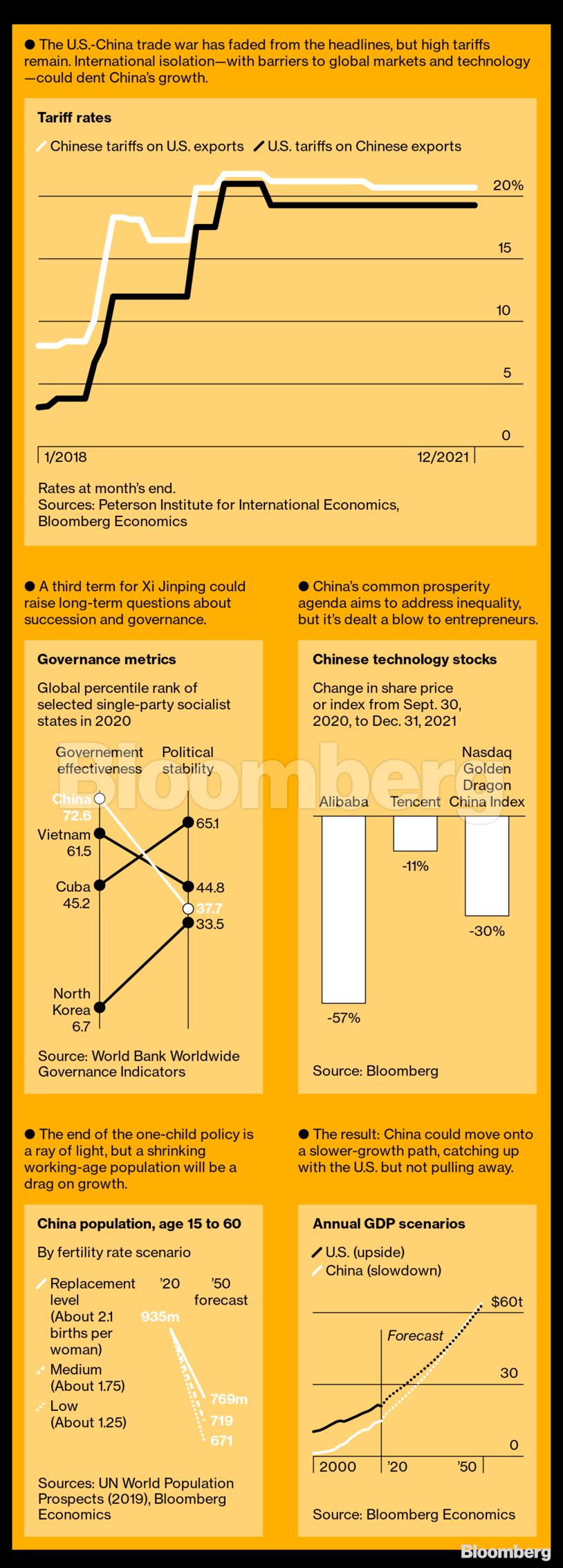 Η ανάπτυξη της οικονομίας της Κίνας μπορεί να επιβραδυνθεί και με άλλους τρόπους. Το δημογραφικό πρόβλημα και η απομόνωση από τα διεθνή θα μπορούσαν να επηρεάσουν την αναπτυξιακή τροχιά. Εάν η αντίστοιχη ανάπτυξη των ΗΠΑ επιδείξει παράλληλη βελτίωση, η Κίνα πιθανώς θα παραμείνει στη δεύτερη θέση.