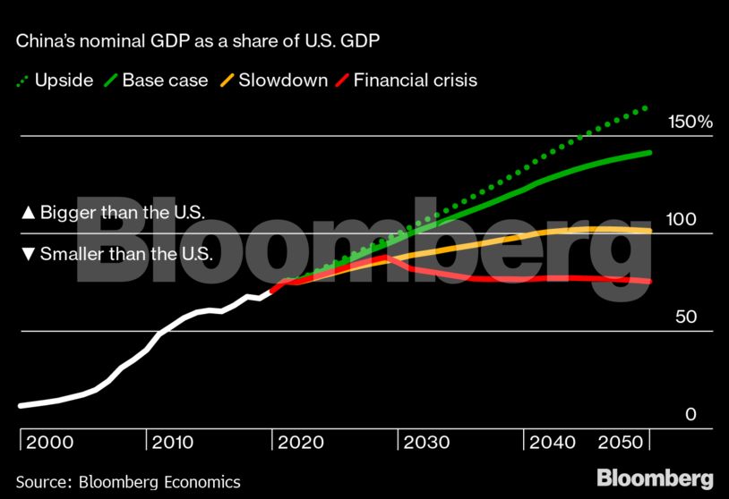 Σύμφωνα με ανάλυση του Bloomberg, η οικονομία της Κίνας ενδέχεται να ξεπεράσει αυτή των ΗΠΑ σε περίπου μία δεκαετία.