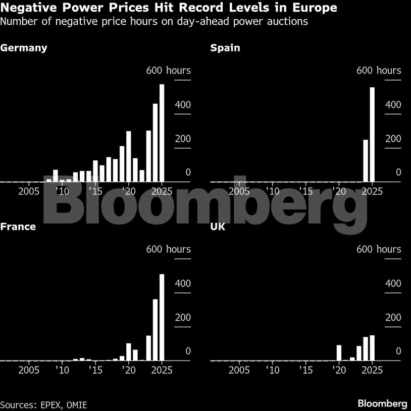 Οι αρνητικές τιμές αναδεικνύουν τη σύγκρουση ανάμεσα στη ραγδαία ανάπτυξη της πράσινης ηλεκτροπαραγωγής, τη στάσιμη ζήτηση και τα επίμονα δομικά προβλήματα των ευρωπαϊκών δικτύων. Η Γερμανία κατέγραψε 573 ώρες με αρνητικές τιμές το 2025, αύξηση 25% σε σχέση με το προηγούμενο έτος. Στην Ισπανία, όπου οι αρνητικές τιμές εμφανίστηκαν για πρώτη φορά το 2024, ο αριθμός τους διπλασιάστηκε σε ετήσια βάση.