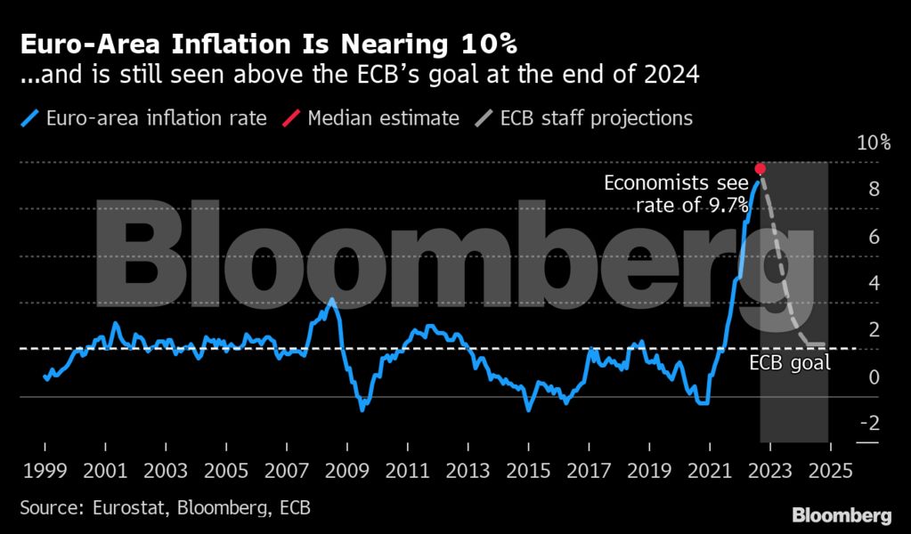 Σύμφωνα ωστόσο με τους οικονομολόγους που ρωτήθηκαν από το Bloomberg, ο πληθωρισμός στην Ευρωζώνη εκτιμάται ότι διαμορφώθηκε στο 9,7% τον Σεπτέμβριο, εκτίμηση που εφόσον επαληθευθεί θα ασκήσει περαιτέρω πίεση στην ΕΚΤ.
