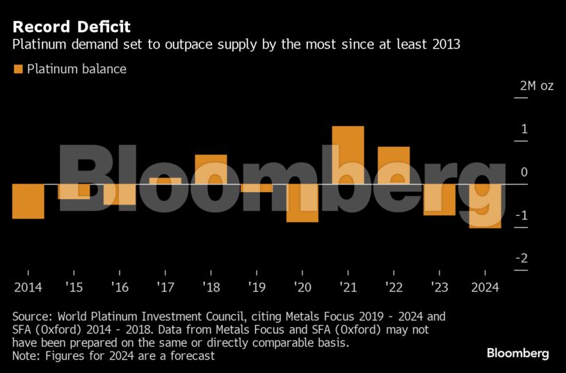 Η απότομη αύξηση των τοποθετήσεων από τα χρηματιστηριακά κεφάλαια και η ισχυρή αύξηση της κινεζικής ζήτησης για μεγάλες ράβδους προβλέπεται ότι θα συμβάλουν στη δημιουργία ελλείμματος άνω του 1 εκατομμυρίου ουγγιών το 2024, σύμφωνα με την τριμηνιαία έκθεση του Παγκόσμιου Συμβουλίου Επενδύσεων Πλατίνας. Αυτό έρχεται μετά από έλλειμμα 731.000 ουγγιών πέρυσι.