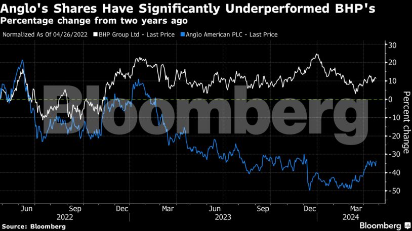 Κατά τη διάρκεια του περασμένου έτους, οι μετοχές της Anglo είχαν χαμηλότερες επιδόσεις έναντι των αντιπάλων της. Η BHP, η οποία διαπραγματεύεται στο Λονδίνο και το Σίδνεϊ, έχει χρηματιστηριακή αξία περίπου 149 δισεκατομμυρίων δολαρίων.