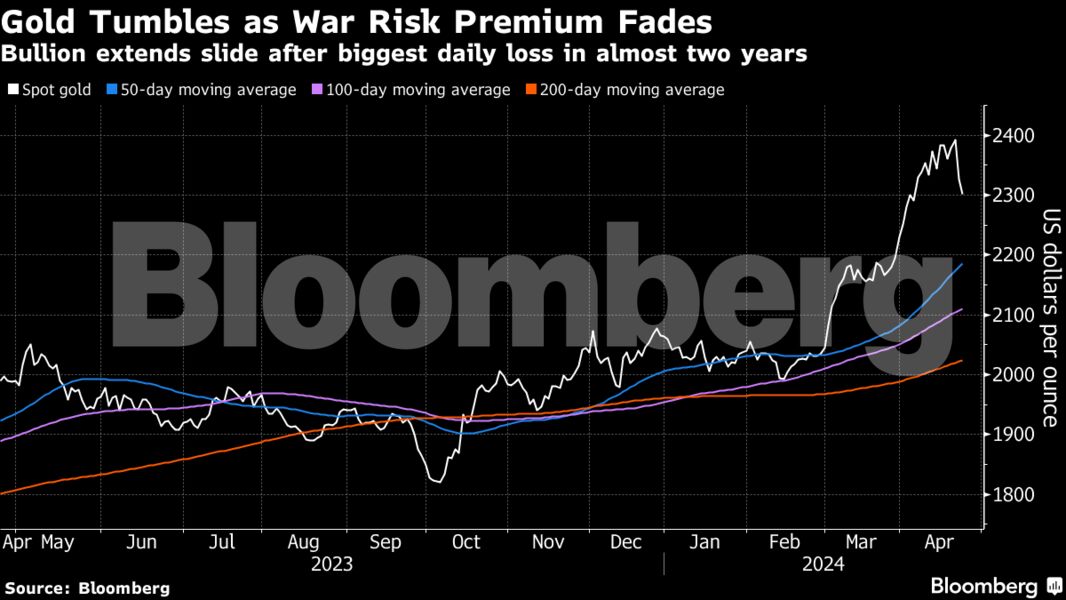 Ο χρυσός επέκτεινε τις απώλειες μετά τη μεγαλύτερη ημερήσια πτώση του εδώ και σχεδόν δύο χρόνια, με την υποχώρηση της έντασης στη Μέση Ανατολή και τις ενδείξεις ότι η Ομοσπονδιακή Τράπεζα των ΗΠΑ θα διατηρήσει τα επιτόκια υψηλότερα για μεγαλύτερο χρονικό διάστημα, περιορίζοντας τη ζήτηση.