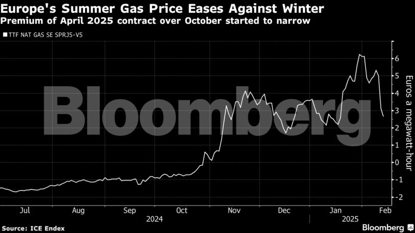 Η διαφορά μεταξύ των τιμών του καλοκαιριού και εκείνων της επόμενης περιόδου θέρμανσης μειώθηκε περαιτέρω την Πέμπτη. Έχει χάσει περισσότερο από το ήμισυ της αξίας της από τότε που έφθασε στα 6,75 ευρώ ανά μεγαβατώρα στις 31 Ιανουαρίου.