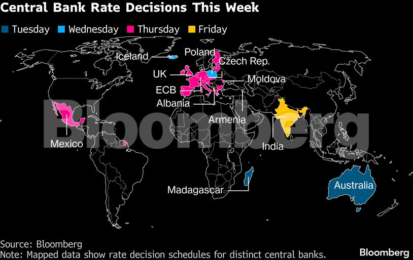 Στην Ασία, οι κεντρικές τράπεζες ενδέχεται να κινηθούν σε αντίθετες κατευθύνσεις, με την Τράπεζα της Αυστραλίας να εξετάζει αύξηση επιτοκίων και την Ινδία πιθανόν να προχωρά σε μείωση. Στην Ευρώπη, τη Μέση Ανατολή και την Αφρική, το ενδιαφέρον στρέφεται στις αποφάσεις της Τράπεζας της Αγγλίας, της Πολωνίας και άλλων χωρών, καθώς και στα μακροοικονομικά στοιχεία από τη Γερμανία και τη Σουηδία.