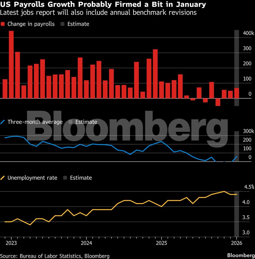 Στις Ηνωμένες Πολιτείες, τα στοιχεία για την απασχόληση του Ιανουαρίου αναμένεται να δείξουν μια ήπια ανάκαμψη των προσλήψεων, με τις μισθοδοσίες να αυξάνονται κατά περίπου 68.000, σύμφωνα με εκτιμήσεις οικονομολόγων. Το ποσοστό ανεργίας προβλέπεται να παραμείνει στο 4,4%. Την ίδια στιγμή, ο Τραμπ ανακοίνωσε την αντικατάσταση του προέδρου της Fed, Τζερόμ Πάουελ, με τον Κέβιν Γουόρς, κίνηση που προσθέτει νέα αβεβαιότητα στη νομισματική πολιτική των ΗΠΑ.