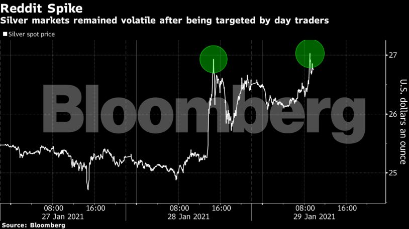 Χθες Πέμπτη, οι μετοχές εξόρυξης ασημιού σημείωσαν άνοδο ενώ το μεγαλύτερο fund συναλλαγών ασημιού, το iShares Silver Trust, κατέγραψε έναν τεράστιο αριθμό option αγοράς, όταν έγινε αντιληπτό ότι η συγκεκριμένη αγορά έγινε στόχος για τους wallstreetbets της Reddit. Τα σχόλια για το μέταλλο ξεκίνησαν την Τετάρτη να εμφανίζονται στην πλατφόρμα που έγινε διάσημη χάρη στην εκτόξευση της μετοχής της GameStop αυτή την εβδομάδα.