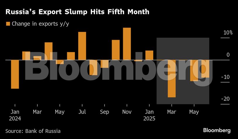 Η ρωσική οικονομία συνεχίζει να δέχεται πιέσεις από τη μείωση των τιμών των βασικών εμπορευμάτων, με τις εξαγωγές της να συρρικνώνονται για πέμπτο διαδοχικό μήνα τον Ιούνιο. Σύμφωνα με στοιχεία που δημοσίευσε την Πέμπτη η Κεντρική Τράπεζα της Ρωσίας, οι αποστολές στο εξωτερικό υποχώρησαν περίπου 8% σε ετήσια βάση, μετά από πτώση σχεδόν 10% τον Μάιο.