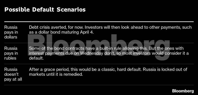 Παρά την ανακοίνωση του Ρώσου ΥΠΟΙΚ για αποπληρωμή των τόκων ύψους $117 εκατ. αυτή την εβδομάδα, δεν έχει γίνει ξεκάθαρο το νόμισμα στο οποίο θα αποπληρωθούν. Σημειωτέων πως βάσει των όρων των ομολόγων, η αποπληρωμή σε ρούβλια δεν είναι δυνατή. Εάν η Ρωσία αθετήσει την αποπληρωμή των τόκων θα έχει περίοδο χάριτος 30 ημερών (μέχρι τις 15 Απριλίου) για να το κάνει.