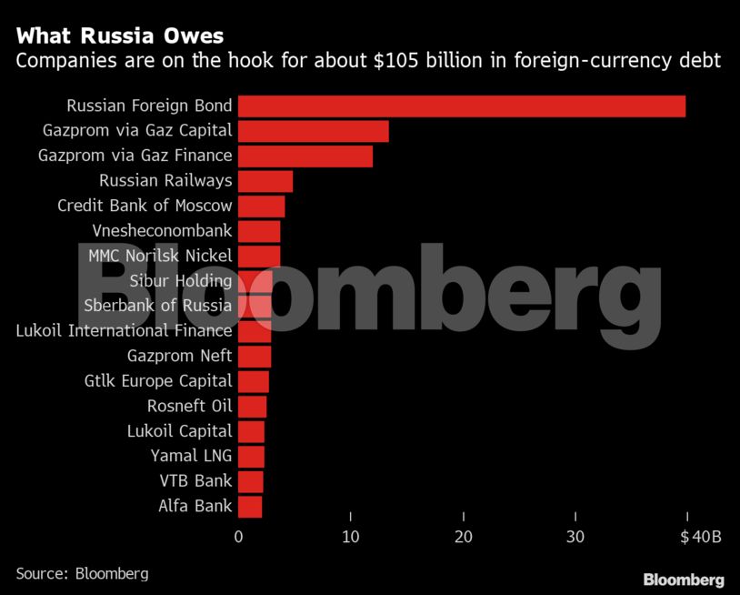 Περίπου τα $120 δισ. των εκκρεμών ομολογιακών υποχρεώσεων τόσο του ρωσικού δημοσίου όσο και των ρωσικών εταιρειών είναι σε δολάρια, με τα υπόλοιπα να είναι σε ευρώ, σύμφωνα με το Bloomberg. Περίπου τα $25 δισ. εξ αυτών έχουν εκδοθεί από τη Gazprom.