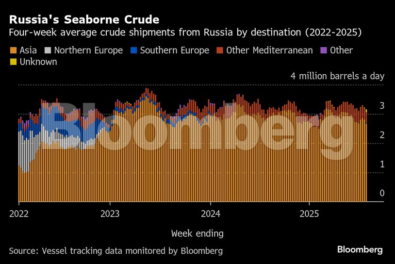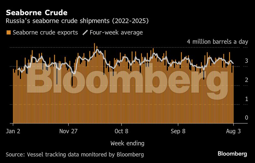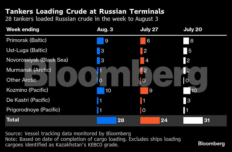 Την εβδομάδα έως τις 3 Αυγούστου, 28 δεξαμενόπλοια μετέφεραν 20,97 εκατ. βαρέλια ρωσικού αργού, έναντι 18,63 εκατ. βαρελιών την προηγούμενη εβδομάδα. Οι μέσες ροές τεσσάρων εβδομάδων διαμορφώθηκαν σε 3,15 εκατ. βαρέλια ημερησίως, μειωμένες κατά 70.000 βαρέλια από την προηγούμενη περίοδο.
