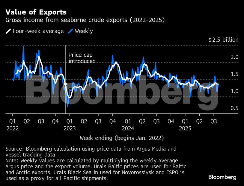 Σε τετραεβδομαδιαία βάση, το Urals διαμορφώθηκε στα 58,60 δολάρια, το ESPO στα 69,18 δολάρια, με τη συνολική αξία εξαγωγών να κυμαίνεται σταθερά στα 1,36 δισ. δολάρια την εβδομάδα.