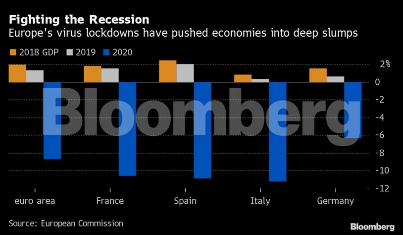 Η Ευρωπαϊκή Επιτροπή προβλέπει ύφεση 8,7% στις 19 χώρες του ευρώ για φέτος, με τη Γαλλία, την Ιταλία και την Ισπανία να αναμένεται πως θα παρουσιάσουν διψήφια πτώση του ΑΕΠ τους.