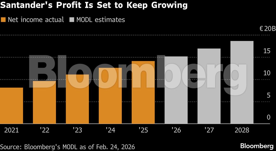 Η κερδοφορία της Santander έχει ενισχυθεί σημαντικά τα τελευταία χρόνια, σε περιβάλλον υψηλότερων επιτοκίων. Η μετοχή της, που επί μακρόν υστερούσε έναντι των ανταγωνιστών, υπερδιπλασιάστηκε το 2025, καθιστώντας την την πλέον αποτιμημένη τράπεζα στην ηπειρωτική Ευρώπη.