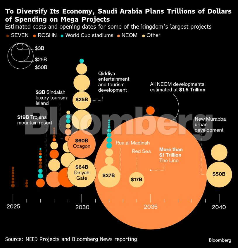 Τα γιγαντιαία επενδυτικά σχέδια – κυρίως μια φουτουριστική νέα πόλη με την ονομασία Neom που θα μπορούσε να κοστίσει πάνω από 1,5 τρισεκατομμύριο δολάρια αν ολοκληρωθεί, σύμφωνα με εκτιμήσεις του αμερικανικού υπουργείου Εξωτερικών και ατόμων που γνωρίζουν την κατασκευή – έχουν ωθήσει τη χώρα σε ένα διευρυνόμενο έλλειμμα. Το Neom είχε προβλεφθεί ότι θα κόστιζε 500 δισεκατομμύρια δολάρια όταν παρουσιάστηκε το 2017.