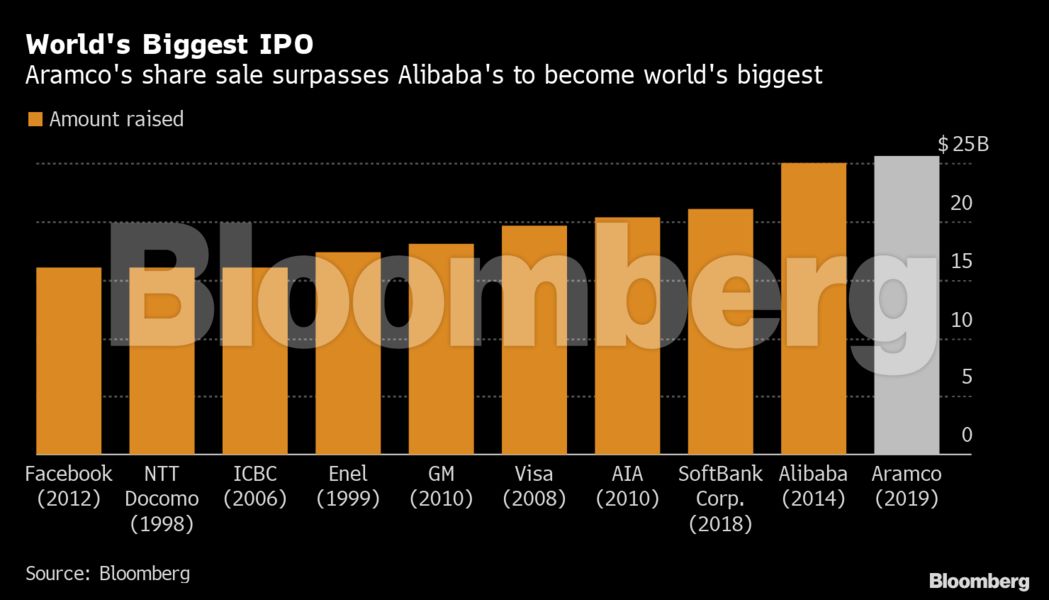 Η Saudi Aramco, η μεγάλη εταιρεία πετρελαιοειδών της Σαουδικής Αραβίας, συγκέντρωσε 25,6 δισεκατομμύρια δολάρια από τη μεγαλύτερη αρχική δημόσια προσφορά (IPO) στον κόσμο, κλείνοντας μια φάση της ζωής της που ταυτίστηκε με τον αμφιλεγόμενο πρίγκιπα του βασιλείου και τα σχέδιά του για την αναμόρφωση αυτού του κράτους.