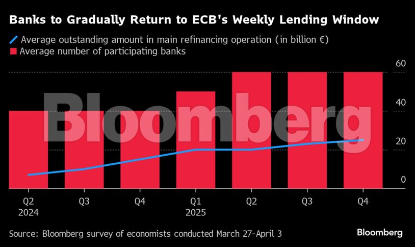 Οι συμμετέχοντες στην έρευνα προβλέπουν επίσης σταδιακή αύξηση του δανεισμού από την εβδομαδιαία πράξη αναχρηματοδότησης της ΕΚΤ, με παράλληλη αύξηση του αριθμού των συμμετεχόντων τραπεζών.