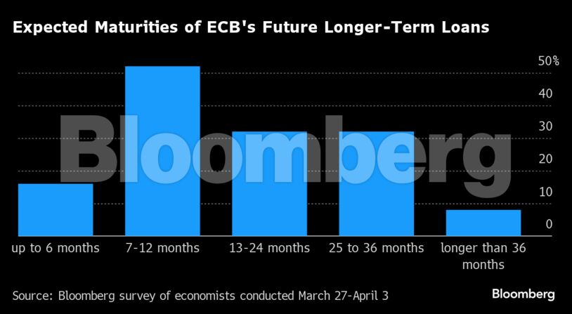 Η πλειονότητα όλων των οικονομολόγων που συμμετείχαν στην έρευνα αναμένει πως η ΕΚΤ θα προσφέρει πρόσθετα τραπεζικά δάνεια με διάρκεια 7-12 μηνών. Το ένα τρίτο εξ αυτών προβλέπει επίσης προσφορές μεγαλύτερης διάρκειας έως δύο και τρία έτη.
