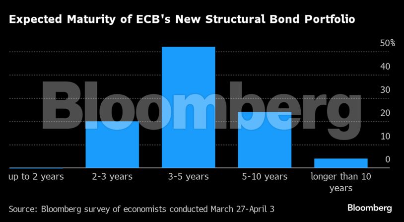 Οι ερωτηθέντες οικονομολόγοι προβλέπουν ότι το συνολικό ενεργητικό που κατέχει η ΕΚΤ θα συρρικνωθεί στα 5,4 τρισ. ευρώ πριν δημιουργηθεί το νέο χαρτοφυλάκιο ομολόγων.