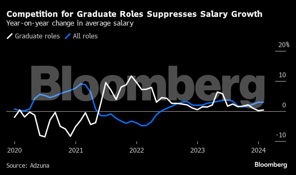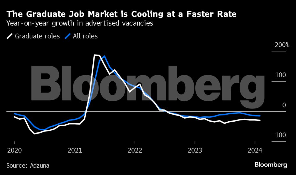 Οι λιγοστές ευκαιρίες για τους πτυχιούχους έχουν αναστατώσει την αγορά εργασίας, με τους εργοδότες να περιορίζουν τις προσλήψεις μετά την οικονομική ύφεση του προηγούμενου έτους. Αυτό αντανακλά τις προσπάθειες της Τράπεζας της Αγγλίας να ελέγξει τις πληθωριστικές πιέσεις μέσω της αύξησης των επιτοκίων στα υψηλότερα επίπεδα των τελευταίων 16 ετών, με σκοπό να μειωθεί η πίεση που ασκείται στις τιμές από τη γρήγορη αύξηση των μισθών.