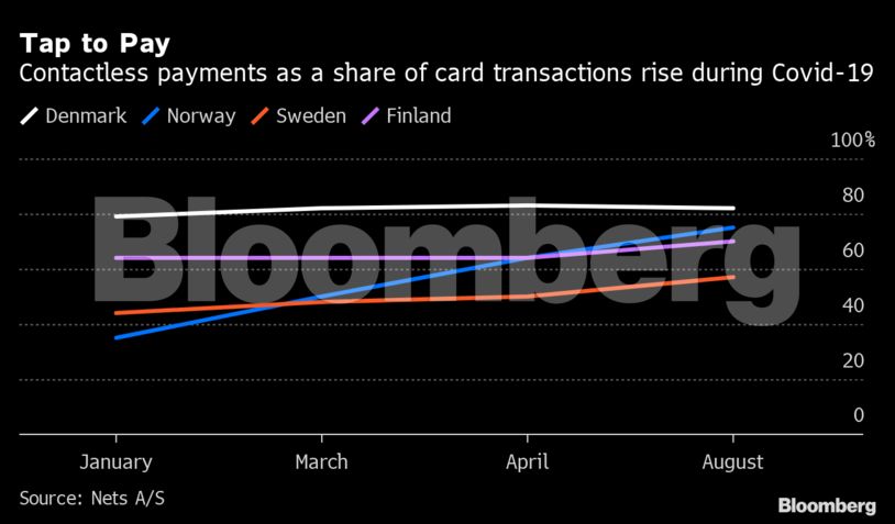 Οι πληρωμές καρτών χωρίς επαφή έχουν αυξηθεί στις Σκανδιναβικές χώρες, με τις συναλλαγές «tap-to-pay» να αυξάνονται κατά 30% στη Σουηδία και 114% στη Νορβηγία από τον Ιανουάριο έως τον Αύγουστο, σύμφωνα με τα στοιχεία της εταιρείας υπηρεσιών ηλεκτρονικών πληρωμών Nets A/S.