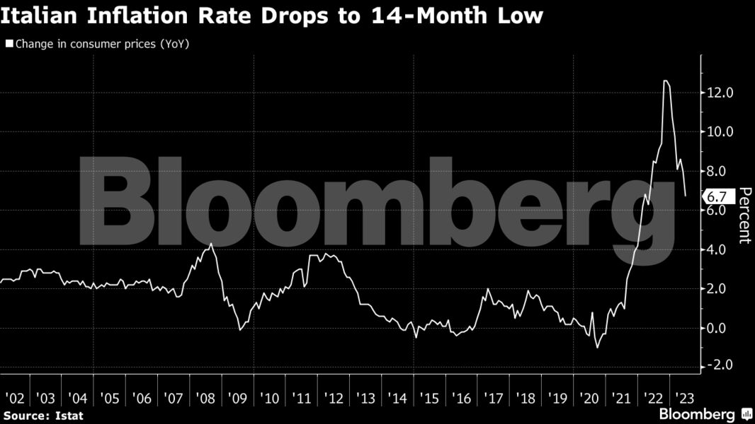 Ο πληθωρισμός της Ιταλίας υποχώρησε σε χαμηλό 14 μηνών τον Ιούνιο, καθώς ο δείκτης τιμών καταναλωτή σημείωσε αύξηση της τάξης του 6,7% σε ετήσια βάση. Υπενθυμίζεται ότι τον προηγούμενο μήνα ο πληθωρισμός είχε σκαρφαλώσει στο 8%.