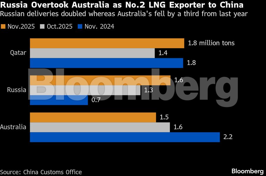 Οι παραδόσεις του αερίου από τη Ρωσία υπερδιπλασιάστηκαν σε σχέση με έναν χρόνο πριν, φθάνοντας τους 1,6 εκατομμύρια τόνους τον περασμένο μήνα, σύμφωνα με τα τελωνειακά στοιχεία που δημοσιεύθηκαν το Σαββατοκύριακο. Η αύξηση αυτή επέτρεψε στη Ρωσία να ξεπεράσει την Αυστραλία και να καταστεί ο μεγαλύτερος προμηθευτής της Κίνας μετά το Κατάρ. Η Μόσχα στράφηκε στη μεγαλύτερη αγορά φυσικού αερίου της Ασίας για να αντισταθμίσει τη μείωση των αποστολών προς την Ευρώπη, η οποία για δεκαετίες ήταν ο μεγαλύτερος αγοραστής της, μέχρι την εισβολή στην Ουκρανία. Η Ρωσία αναγκάστηκε να μειώσει τις τιμές για να αυξήσει την ελκυστικότητα των φορτίων της — το LNG της ήταν το φθηνότερο μεταξύ των 12 προμηθευτών της Κίνας και περίπου 10% κάτω από τον μέσο όρο, στα 9,85 δολάρια ανά εκατομμύριο British thermal units τον Νοέμβριο, σύμφωνα με τα τελωνειακά στοιχεία.