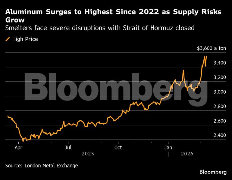 Οι τιμές αυξήθηκαν έως και 2,6% φτάνοντας τα 3.546,50 δολάρια ανά τόνο, ξεπερνώντας το υψηλό της Δευτέρας και φτάνοντας στο υψηλότερο επίπεδο από τον Μάρτιο του 2022. Οι τιμές έχουν εκτοξευτεί από την αρχή της σύγκρουσης στο Ιράν, η οποία έχει περιορίσει την προσφορά στην περιοχή, η οποία αντιπροσωπεύει περίπου το 9% της παγκόσμιας παραγωγής. Ένας μεγάλος παραγωγός αλουμινίου στο Κατάρ έχει ήδη μειώσει την παραγωγή του, ενώ άλλοι αντιμετωπίζουν διαταραχές στις αποστολές μετάλλων και πρώτων υλών καθώς τα Στενά του Ορμούζ παραμένουν ουσιαστικά κλειστά.