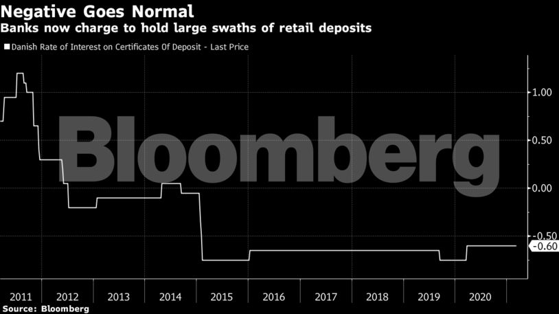 Tα αρνητικά επιτόκια μπορεί να αποτελούν φόβο και τρόμο πολλών τραπεζιτών, αλλά αποτελούν το στάνταρ στη Δανία. Τα αποτελέσματα του τέταρτου τριμήνου δείχνουν πως οι μεγαλύτερες τράπεζες της Δανίας έχουν ξεκινήσει τις χρεώσεις για καταθέσεις που ξεπερνούν τα $16.000. Η Κάρεν Φρόσιγκ, CEO της Sydbank A/S ανέφερε πως η τραπεζική βιομηχανία της Δανίας κατάφερε να κάνει κάτι που οι περισσότεροι φοβούνται, μέρος της κανονικότητας.