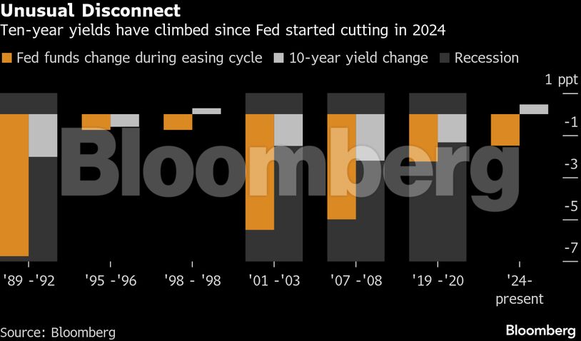 Όταν η Fed αυξάνει ή μειώνει τα βραχυπρόθεσμα επιτόκια, οι αποδόσεις των μακροπρόθεσμων ομολόγων τείνουν να ακολουθούν. Ακόμη και στους δύο μοναδικούς κύκλους χαλάρωσης εκτός των περιόδων ύφεσης των τελευταίων τεσσάρων δεκαετιών — το 1995 και το 1998, όταν η Fed μείωσε τα επιτόκια μόνο κατά 75 μονάδες βάσης — οι αποδόσεις των 10ετών ομολόγων μειώθηκαν ή αυξήθηκαν λιγότερο από ό,τι κατά την τρέχουσα περίοδο.