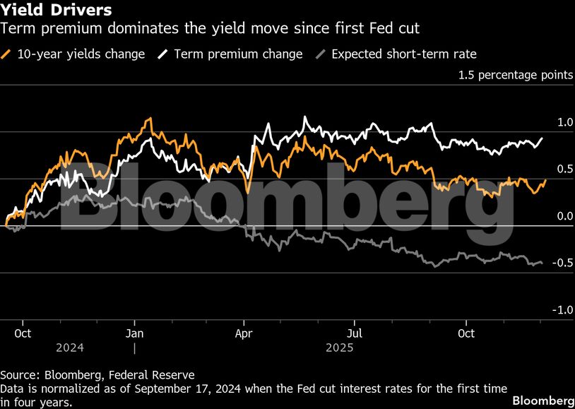 Αυτό τους αποζημιώνει για τους πιθανούς κινδύνους που ενδέχεται να προκύψουν στο μέλλον, όπως ο υψηλός πληθωρισμός ή το μη βιώσιμο χρέος της ομοσπονδιακής κυβέρνησης. Αυτό το πρόσθετο επιτόκιο έχει αυξηθεί σχεδόν 1% από την έναρξη του κύκλου μείωσης των επιτοκίων, σύμφωνα με τις εκτιμήσεις της Fed της Νέας Υόρκης.
