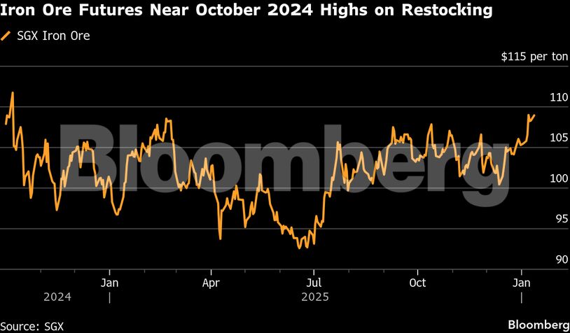 Τα συμβόλαια μελλοντικής εκπλήρωσης για την πρώτη ύλη της χαλυβουργίας ενισχύθηκαν έως και 0,9%, φθάνοντας τα 109,40 δολάρια τον τόνο στη Σιγκαπούρη τη Δευτέρα, καθώς οι κινεζικές χαλυβουργίες προετοιμάζονται για την εποχική αναπλήρωση αποθεμάτων ενόψει της αργίας του Σεληνιακού Νέου Έτους. Το μέταλλο οδεύει προς το υψηλότερο κλείσιμο από τον Οκτώβριο του 2024.
