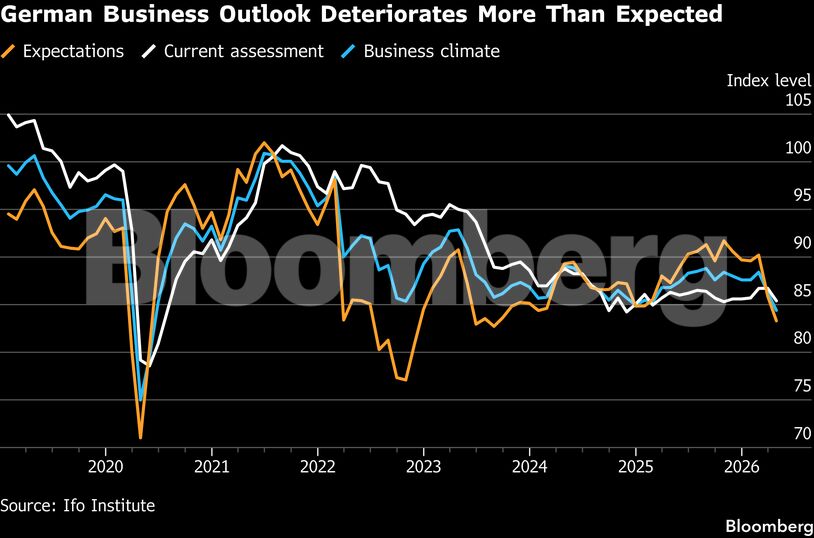 Ο δείκτης προσδοκιών του ινστιτούτου Ifo υποχώρησε στις 83,3 μονάδες τον Απρίλιο, από τις αναθεωρημένες 85,9 του προηγούμενου μήνα — το χαμηλότερο επίπεδο από τον Αύγουστο του 2023. Η τιμή αυτή ήταν κατά πολύ χαμηλότερη από τη μέση εκτίμηση των 85,5 μονάδων σε έρευνα του Bloomberg. Παράλληλα, ο δείκτης που μετρά τις τρέχουσες συνθήκες επιδεινώθηκε επίσης περισσότερο από τις προβλέψεις.
