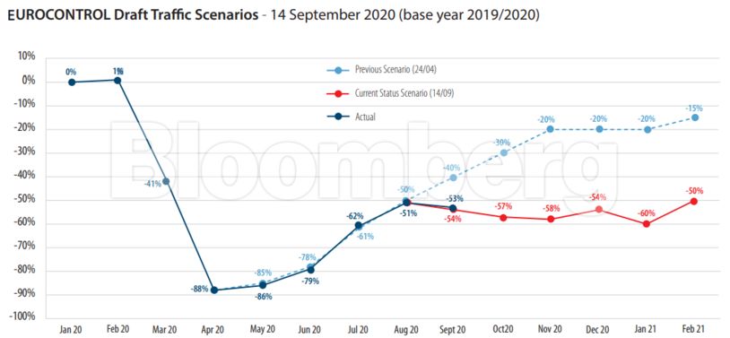 Η Eurocontrol αναφέρει ότι μετά την ανάκαμψη περίπου στο ήμισυ του κανονικού τον Αύγουστο, το ποσοστό των πτήσεων που θα εκτελεστούν θα μειωθεί στο 40% της κανονικής κίνησης τον Ιανουάριο, σε σύγκριση με την προηγούμενη εκτίμησή του ότι ως τον Ιανουάριο θα είχε επανέλθει στο 80% της κανονικής.