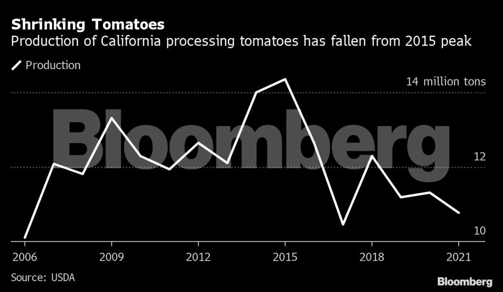 Η καλλιέργεια της Καλιφόρνιας μειώθηκε τα τελευταία έξι χρόνια από το πρόσφατο ανώτατο όριο παραγωγής των 14,4 εκατομμυρίων τόνων το 2015 και το για το 2022 διατηρεί την πτωτική της πορεία, σύμφωνα με στοιχεία του Υπουργείου Γεωργίας των ΗΠΑ. Ο κλάδος αναμένει ότι η φετινή συγκομιδή θα πέσει κάτω από την εκτίμηση του USDA για 11,7 εκατ. τόνους.