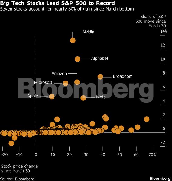Περισσότερο από το μισό της πρόσφατης ανόδου του S&P 500 προέρχεται από επτά μόλις εταιρείες — Nvidia Corp., Amazon.com Inc., Microsoft, Broadcom Inc., Alphabet Inc., Meta Platforms Inc. και Apple Inc. Συνολικά, οι εταιρείες αυτές έχουν προσθέσει περίπου 4 τρισ. δολάρια σε χρηματιστηριακή αξία μέσα σε λίγες εβδομάδες. «Ήταν μια εξαιρετικά γρήγορη ανάκαμψη», σχολίασε ο Paul Wick, επικεφαλής επενδύσεων της Seligman Investments. «Σε κάποιο βαθμό πρόκειται για συναλλαγές αναπλήρωσης και τοποθέτησης».