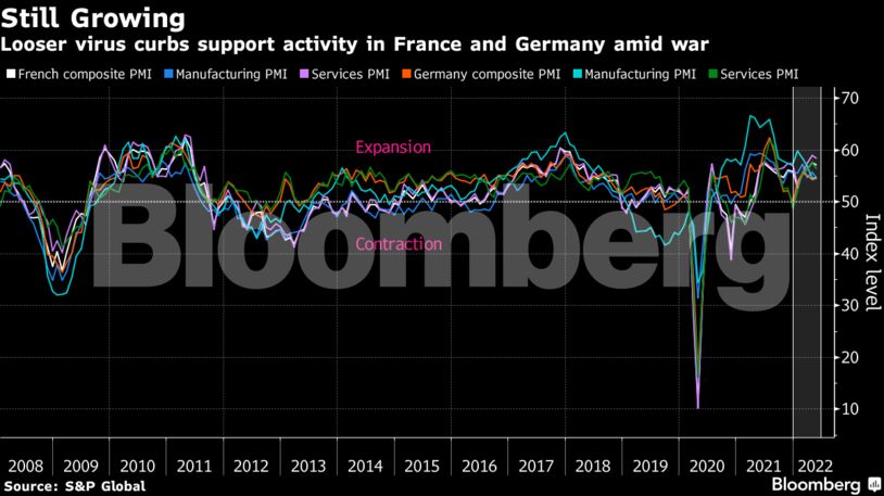 Γερμανία και Γαλλία συνέχισαν να σημειώνουν οικονομική ανάπτυξη τον Μάιο, καθώς επωφελήθηκαν από ένα διατηρήσιμο ριμπάουντ στον κλάδο των υπηρεσιών που αντισταθμίζει τις αρνητικές επιπτώσεις από τη ρωσική εισβολή στην Ουκρανία.
