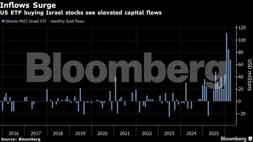 Το εισηγμένο στις ΗΠΑ διαπραγματεύσιμο αμοιβαίο κεφάλαιο (ETF) της BlackRock Inc. που επενδύει σε ισραηλινές μετοχές καταγράφει τις μεγαλύτερες εισροές του από το 2008. Το iShares MSCI Israel ETF προσέλκυσε νέες καταθέσεις για 10 συνεχόμενους μήνες έως τον Μάρτιο, με τις εισροές του πρώτου τριμήνου να ισούνται με το συνολικό ποσό που συγκεντρώθηκε σε ολόκληρο το 2025.